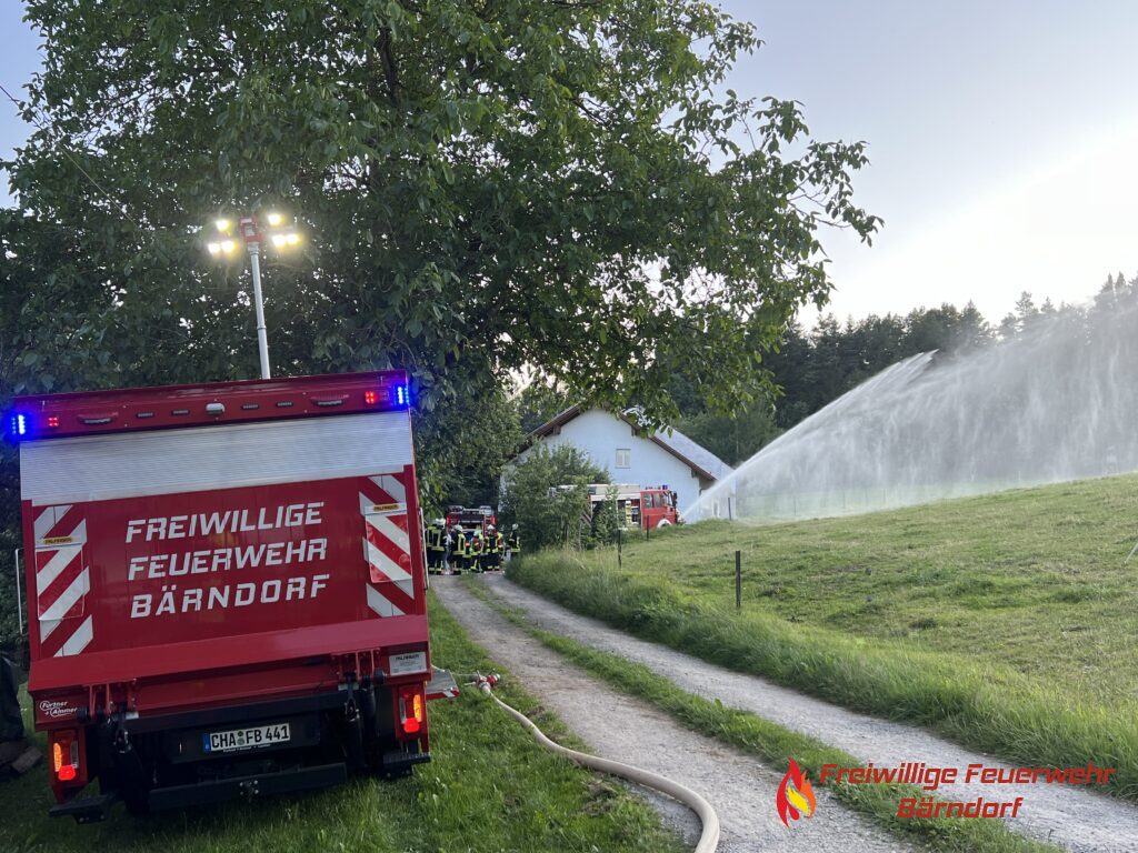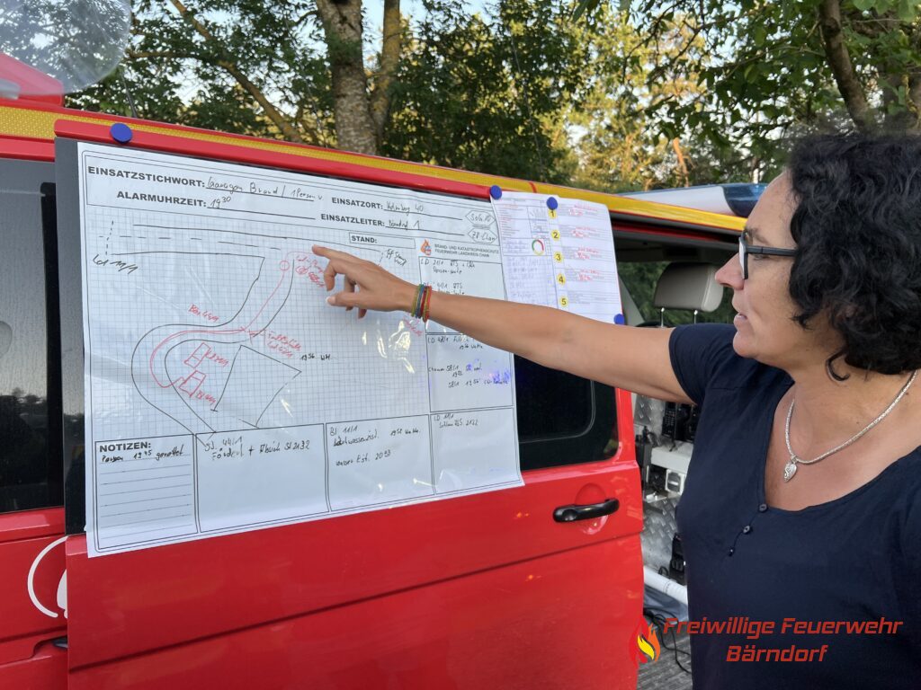 Die Abschnittsleiter resümierten ebenfalls einen guten Übungsverlauf, die Förderleitung habe man zügig in Betrieb nehmen können und auch das Arbeiten an der Staatsstraße habe keinerlei Probleme gemacht. Bei der Personenrettung und Brandbekämpfung konnten auch sehr gute Zeiten erreicht werden, das Löschwasser vor Ort aus den beiden Fahrzeugen habe ausgereicht, bei einem Ernstfall wäre jedoch womöglich mehr Wasser nötig. Sarah Baumgartner dankte den Einsatzkräften, dass das Anwesen der Familie beübt worden war, zeigte sich begeistert von der Arbeit und der Ausrüstung der Feuerwehren und sprach ihren größten Respekt für das gelebte Ehrenamt aus. KBM Alexander Beier lobte ebenfalls den guten Übungsverlauf und dankte der Familie Baumgartner sowie den Bürgermeistern für ihr Interesse an der Übung. Man habe an diesem Abend den Startschuss gegeben für den praktischen Einsatz der neuen Führungsunterstützung. Diese soll dem Einsatzleiter einiges an Arbeit abnehmen und den Einsatz dokumentieren. Wichtig hierbei, so der Kreisbrandmeister, sei die strikte Funkgruppentrennung, damit der Funkverkehr auf der jeweiligen Gruppe minimiert werden könne. Er stellte abschließend den Anwesenden noch kurz die Arbeit des Bad Kötztinger Einsatzleitwagens vor und zeigte auf, was im Detail zur Übung niedergeschrieben worden war. KBI Andreas Bergbauer sprach von einem gut gewählten Übungsobjekt und lobte die Arbeit der einzelnen Einsatzabschnitte. Im Winter habe man das Konzept der Führungsunterstützung noch unterhalb des Einsatzes der Unterstützungsgruppe Örtliche Einsatzleitung (UG-ÖEL) noch in der Theorie erarbeitet, nun müsse man diese in der Praxis umsetzen. Das Ziel sei die Bildung von Abschnitten und Schaffen von Strukturen mit dem Ziel, den Einsatzleiter zu unterstützen. Zudem sei die Dokumentation von Einsätzen wichtiger denn je, so Bergbauer. Bürgermeisterin Monika Bergmann zeigte sich beeindruckt, wie schnell alle Aufgaben gemeistert worden waren und lobte das gute Zusammenspiel der verschiedenen Feuerwehren. Ihr Dank galt Josef Speckner für die Organisation der Übung und allen anwesenden Feuerwehrfrauen und Männern für ihren Einsatz jeden Tag und die Bereitschaft zur Weiterbildung. Es „werde ein super Job gemacht, den man nicht groß genug würdigen kann“, so Blaibachs Gemeindeoberhaupt.