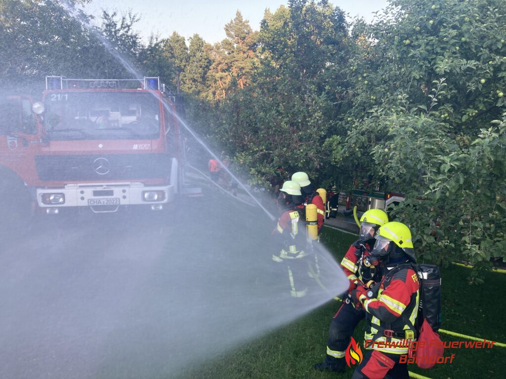 Um 19.30 Uhr „alarmierte“ Kreisbrandmeister Alexander Beier per Funksammelruf die Feuerwehren Bärndorf, Blaibach, Chamerau, Lederdorn, Staning sowie ein Fahrzeug der Feuerwehr Bad Kötzting. Angenommen war ein Garagenbrand mit einer vermissten Person beim Anwesen Baumgartner in Kolmberg 40, welches etwas abgelegen und ohne Wasserversorgung abseits der Staatsstraße 2132 auf Höhe Gadsdorf liegt. Die beengte Zufahrt zum Objekt und die fehlende Wendemöglichkeit für Großfahrzeuge galt es ebenfalls zu meistern.