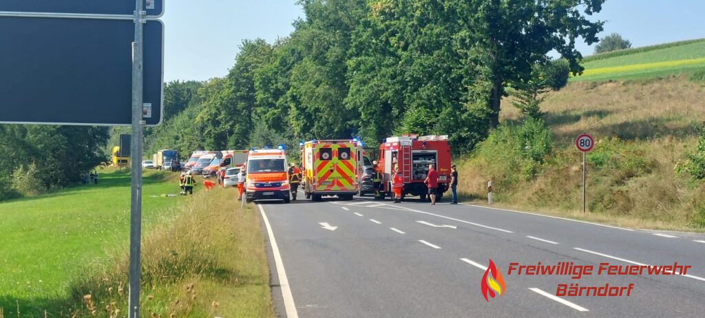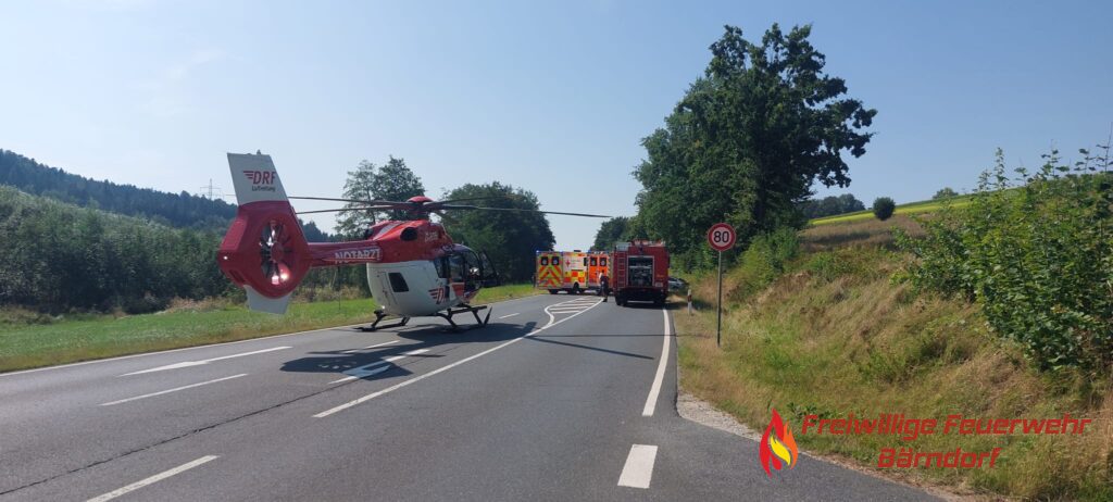 Laut der Alarmierung waren zwei PKW sowie ein Motorrad beteiligt, es sollte mindestens vier Verletzte geben. Deswegen wurden neben uns die Feuerwehren Runding und Lederdorn sowie insgesamt 4 Rettungswagen, 2 Krankentransportwagen und der Rettungshubschrauber aus Regensburg alarmiert. Vor Ort waren insgesamt 7 Verletzte zu versorgen, wovon zwei Insassen eines Autos mittels hydraulischem Rettungsgerät befreit werden mussten. Alle Unfallbeteiligten wurden in Krankenhäuser gebracht, einer der beiden Schwer verletzten wurde durch den Hubschrauber abtransportiert.