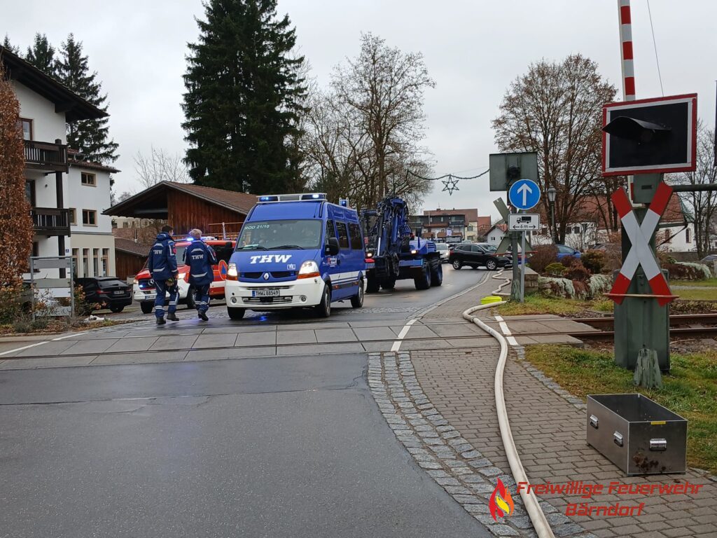 Wir begannen unverzüglich mit dem Aufbau einer Wasserförderung aus dem Regen in Richtung Brandobjekt sowie mit der Absicherung der Schlauchstrecken. Dazu musste die Bahnstrecke zwischen Chamerau und Cham gesperrt werden.